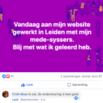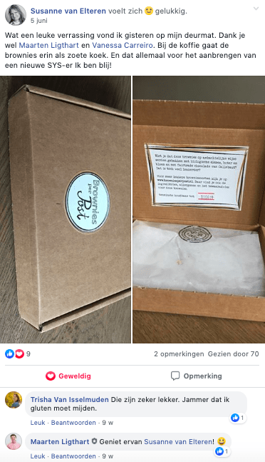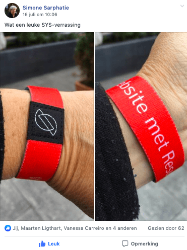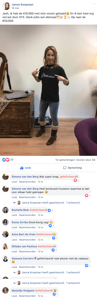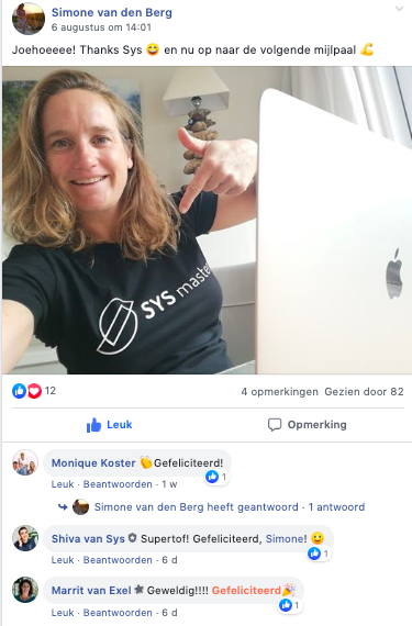 Wij vieren graag mijlpalen samen met jou mee. Daarnaast is de community altijd erg betrokken en kan je altijd op een felicitatie van andere SYS’ers rekenen.