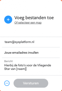 Omdat de afbeeldingen vaak grote bestanden zijn, kan je ze het beste versturen via WeTransfer. Upload de foto’s en verstuur het bestand naar team@sysplatform.nl.